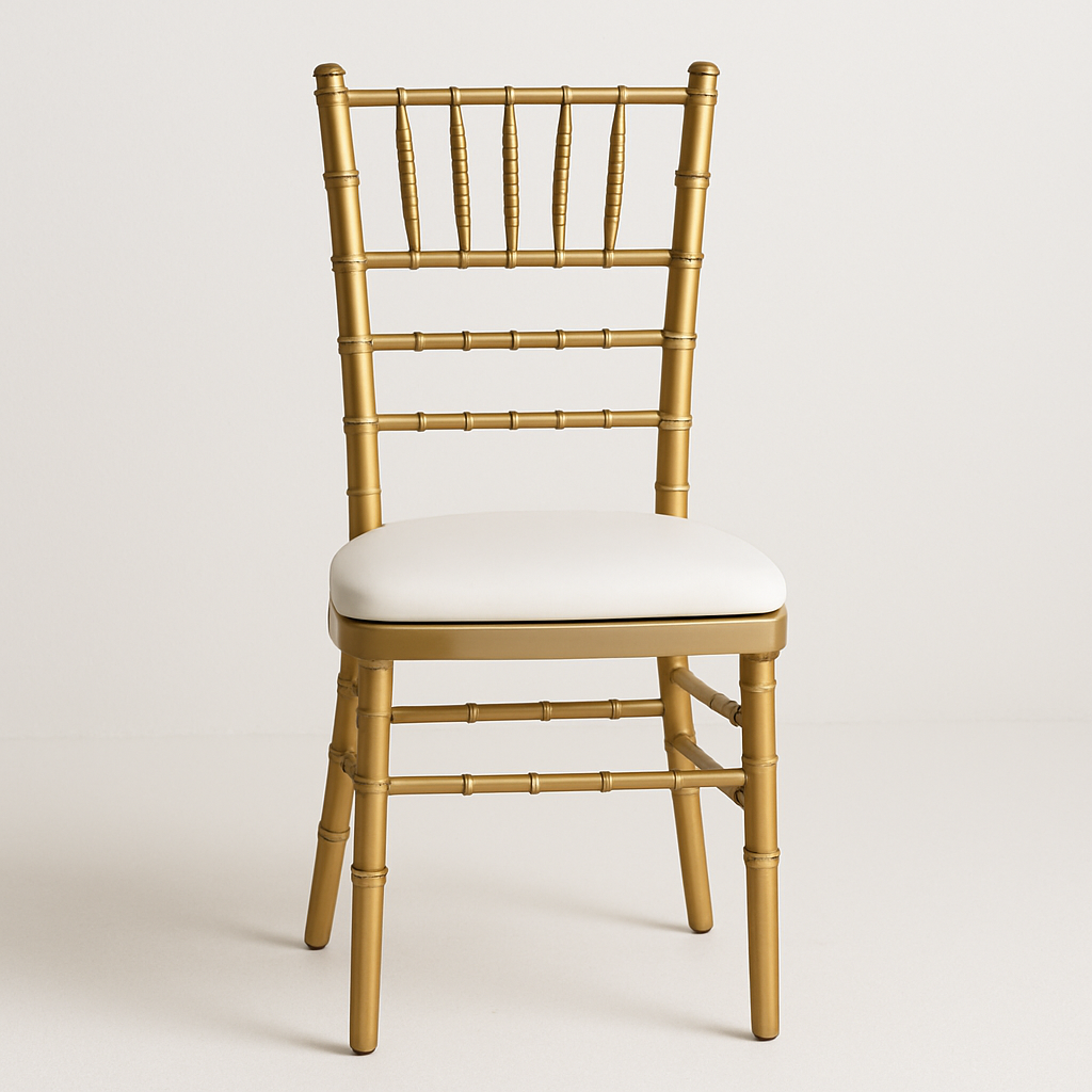 Silla Tiffany dorada, elegante y sofisticada. Ideal para bodas y eventos que buscan un toque clásico y distinguido en su decoración.